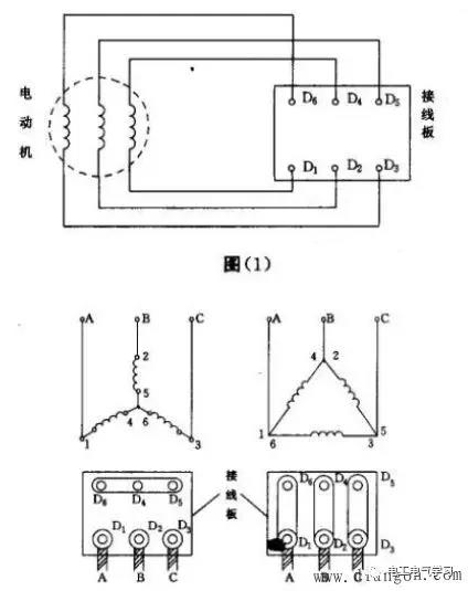 两种接法,与我们的接入没什么关系, 如 图2和3, D1。D2。D3接A。B。C三相,具体的区别是电动机接线盒中的不同, 三个接线片,一般不进行随便修改,我们只要了解他们的区别就行,图2是星型,图3是角型 电动机内部有三组绕组,六个接线端,当把三个绕组的一端连在一起,而另一端分别接电源,连成一个Y型,就是星型接法;这时候电源两相之间的电流是相电流,比线电流小根3倍; 如果把三组绕组的首尾相连,然后三个首尾相连处接电源,连成一个三角形,就是三角形接法;这时候电源两相之间的电流就是线电流,比相电流大根3倍;通常的星三角启动方式目的就是减小启动电流,而通常电机启动的瞬间电流比较大,所以一般先以Y型启动,再转换为三角形。 究竟采用哪种接法,需要看电机铭牌,这和绕组有关系。 如果标有380V或者400V,后面画一个三角 就三角型接法,画Y就星型接法;大部分电机默认三角形接法,也有一些是380V下以Y型运行的。 区别电动机三角接法的功率较大,一般是7.5KW以上采用(也有人说是4KW)星型接法的功率小, 三角接法的电动机劲很大.但是对电网冲击很大,一旦启动,周围的灯泡都要暗2下,所以三角接法的电动机很少直接启动,一般采用降压启动、自偶减压启动、变频启动(我只见过变频启动,不过还没搞明白) 电动机的接法是可以调整的,当电机的铭牌上出现Y/△标志的时候就可以调整了,一般来说,星型接法的电机的电压是三角接法的1.73倍 如Y/△660/380.. 注意区分,Y/△和Y—△ ...Y—△ 的意思的电动机的启动方式是星三角启动。
