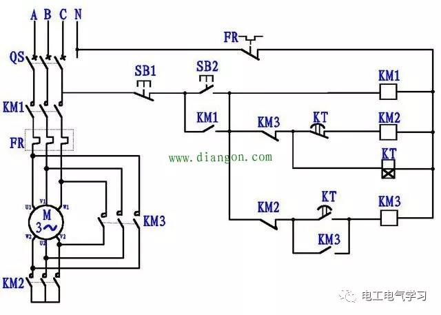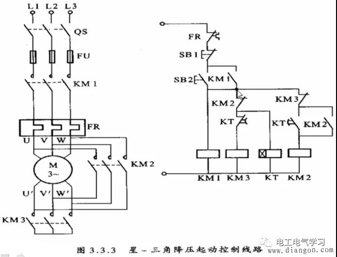 就是对电机的三相绕组在启动时和正常运转时施加的不同的电压,来降低电机启动时的冲击电流。在启动时对电机绕组施加的是星形接法的电源,就是将电源的三条火线分别与电机三个绕组的一个端点相连,将电机三个绕组的另一个端点同时与电源的零线相连,在这种接法下,电机每个绕组所承接的电压就是220V。由于施加的电压较低,所以启动时的电流会比较小点,减少了对电网的冲击,电机也比较容易启动。当电机启动基本正常后,它的工作电流与启动时相比会大幅减少,这时由控制电路通过时间继电器和接触器的转换,将电机三个绕组改成首尾相连,形成所谓三角形连接,并将三角形的每个“角”与电源的三条火线相连,这时电机绕组中所受到的电压变成了380V,电机就能满负荷工作。