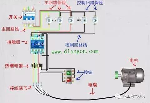 电路当中,要想让电机转动,就必须给电机接线柱通入三相交流电,如图所示,合上电源开关,三相交流电通过黄绿红三根主回路线流经主回路保险、接触器主触点、热继电器主端子、接线端子、电缆、最后到电机接线柱,只要接触器吸合,接通,电机就会转动,接触器释放,电机就停止,这就是主回路。但接触器怎么才能吸合呢?www.diangon.com就需要控制回路控制接触器,控制回路给接触器线圈通电,接触器就吸合,断电就释放。控制电流通过控制保险,黑色控制线、按钮、热继电器辅助触点、接触器辅助触点、到接触器线圈,按下启动按钮,接触器线圈通电,吸合,主触点闭合,控制主回路接通。按下停止按钮,接触器线圈断电,释放,主触点断开,主回路断电。这就是主回路和控制回路的关系。