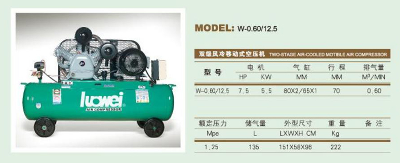 罗威活塞空压机双级风冷移动式系列W-0.60/12.5,正品保证,持久耐用,具体价格请来电咨询!