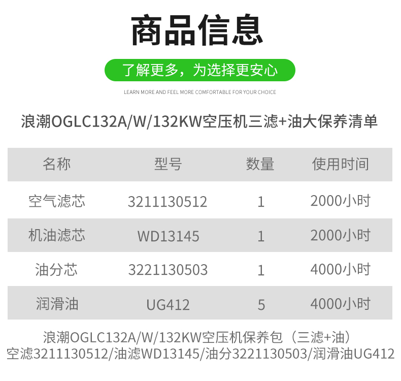 浪潮OGLC132A/W/132KW三滤+油保养包3211130512/WD13145/3221130503/UG412